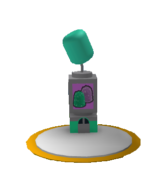 It is decorated with a teal gumdrop on the top, a picture of the gumdrops item on the sides with a pink background, a teal base, and gray rims.