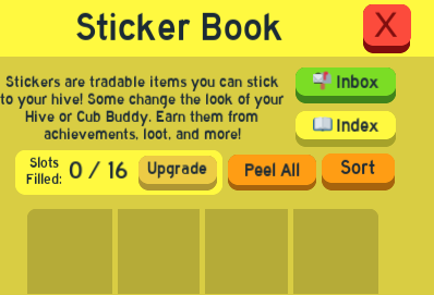The Sticker Book can be found at the top of the inventory, and holds every sticker the player obtains. On the top right, you can view either the inbox or index. Below this, there are options to upgrade capacity, "Peel All" (peels all hive stickers on the player's hive), and "Sort" (sorts out the stickers by the order they appear in the Sticker Index).
