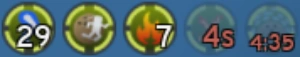 可以在快捷欄上方看到的被動技能圖標,或是手機板的快捷欄旁邊。這些圖標為疾行脈衝、椰子疾行、點燃、X形火焰以及緊急椰子護盾。